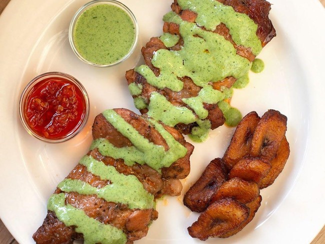 Uniknya ayam panggang ini dimakan dengan pisang goreng dan saus hijau. Saus dari yogurt dan cabe hijau ini rasanya pedas creamy. Pelengkapnya pisang mengkal yang digoreng kering.