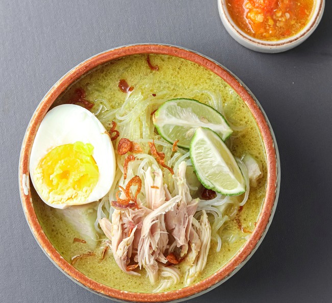 Berkuah kaldu campur santan segar, soto ayam ini gurih enak. Bumbu kemiri dan kunyit membuat rasanya semakin gurih pekat dan sedap.