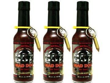 357 Mad Dog Hot Sauce, begitulah sebutan untuk nama saus cabai terpedas di dunia ini. Saking pedasnya, bahkan para konsumen sudah diperingatkan terlebih dahulu dengan aksesoris peluru yang digantungkan di tiap leher botol. Konon peluru tersebut melambangkan rasa pedas dari saus cabai yang dijamin bisa meledakkan mulut bagi mereka yang coba-coba memakannya.