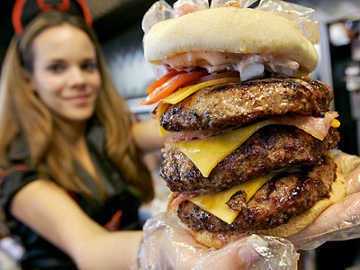 Seorang wanita berusia 40 tahun di Las Vegas, pingsan setelah makan burger porsi ekstra jumbo di Heart Attack Grill, Los Angeles, Amerika. Wanita ini juga mengisap rokok dan minum saat manyantap burgernya.
