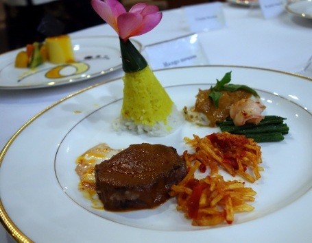 Sebagai pembuka, ada lumpia Semarang dan pindang serani udang. Hidangan nusantara ini kemudian dilanjutkan dengan kombinasi modern dari tumpeng putih-kuning serta daging dan ikan. Daging tenderloin diberi saus rendang yang ringan, sementara ikan cod disajikan dengan saus gulai.