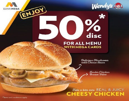 Cheesy Chicken Burger seharga mulai Rp. 30.909 per buah ini bisa Anda nikmati di semua gerai Wendy's. Khusus untuk pembelian minimal Rp.300.000 dengan kartu kredit dan debit Bank Mega Wendy's Anda bisa mendapat diskon 50%.