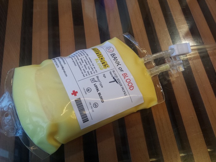 Ada dua orang yang memakai jubah hijau seperti baju dokter bedah di dalamnya. Ternyata, Bank of Blood adalah stand susu berwadah kantung darah. Anda bebas memilih susu dengan rasa sesuai selera. Ada rasa bubble gum, green tea, banana, taro, dan red velvet. Sekantung Bank of Blood dihargai Rp 33.000. Untuk membukanya, Anda harus menggeser sumbat di atasnya.