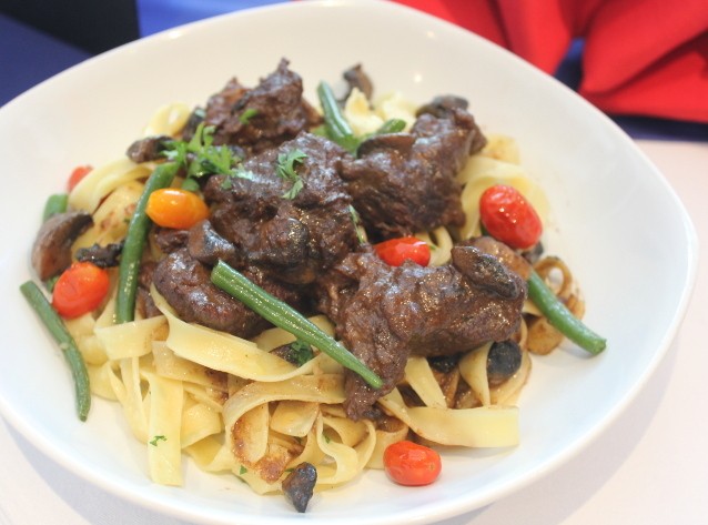 Makanan utama berupa Norwegian Salmon Aioli Sauce with Ratatouille Vegetables jadi santapan selanjutnya. Salmon panggang yang gurih ditumpuk ke atas mashed potato lembut. Hidangan ini tersaji bersama saus aioli, tomat ceri, asparagus, buncis dan irisan jamur.
