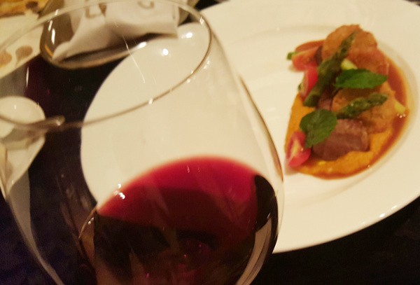 Grilled Lamb Loin dalam bentuk potongan disajikan butternut squash yang dilumat, asparagus, green peas lumat dibentuk kepingan dan digoreng kering. Daging kambing dengan paduan manis labu ini berpadu dengan Beringer Founders’ Estate Cabernet Sauvignon 2013. Aroma berry yang kuat, sedikit aroma mint dan vanila membilas jejak daging kambing di mulut.