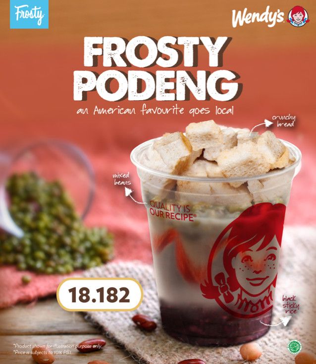 Selain hidangan utama, Wendy's juga tawarkan Frosty Podeng yang cocok untuk segarkan tenggorokan. Dessert yang diadaptasi dari es podeng asal Indonesia ini terdiri dari es krim cokelat frosty yang diberi kacang hijau, kacang tanah, kacang merah, dan ketan hitam.