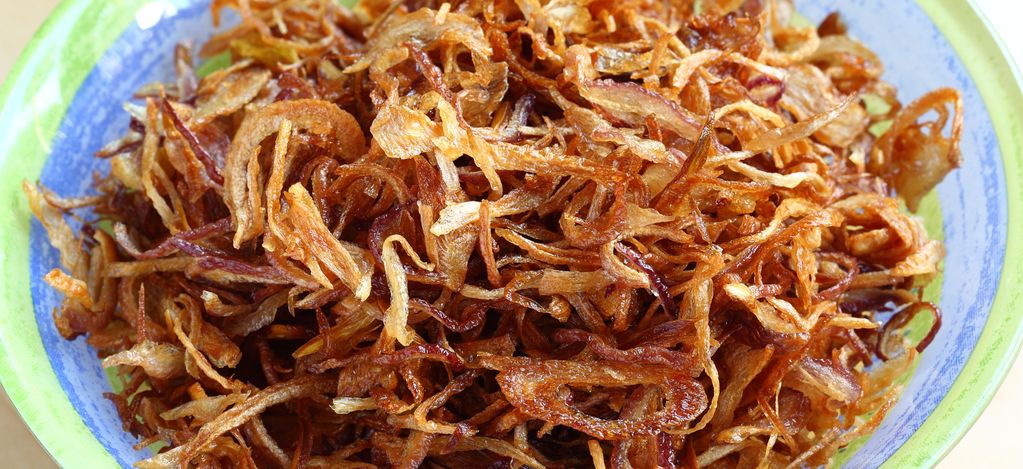 Irisan bawang goreng dengan warna kecokelatan bisa Anda taburkan sebelum menyantai sajian olahan daging. Ini dapat membuat makanan memiliki aroma sedap dan makin gurih.