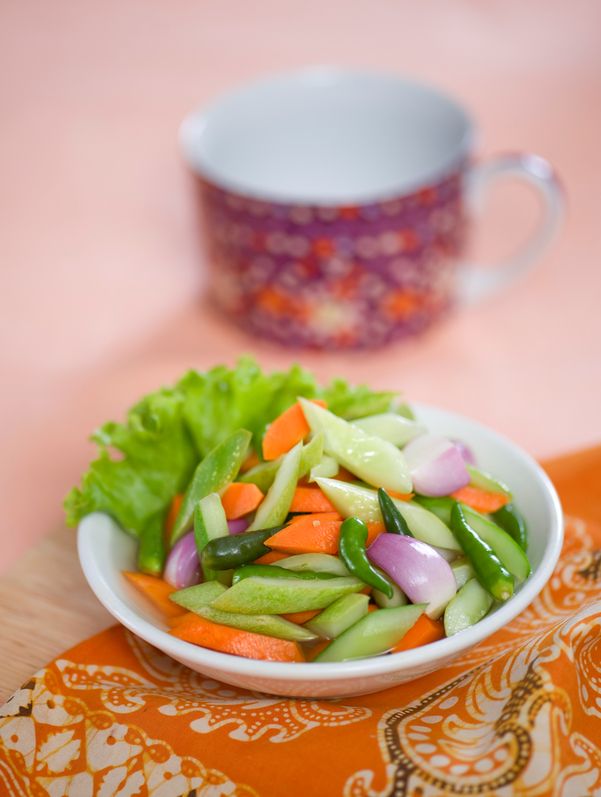 Rasanya yang segar membuat acar cocok jadi sajian pelengkap enak. Dibuat dengan potongan timun, wortel, bawang merah dan cabai rawit. Dimasak dengan cara mencampurkan tumisan bumbu seperti kemiri, bawang merah, bawang putih, cabai, jintan dan ketumbar yang dimasak dengan air, garam dan gula hingga mendidih.