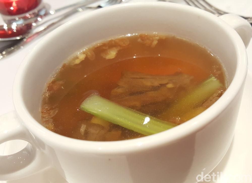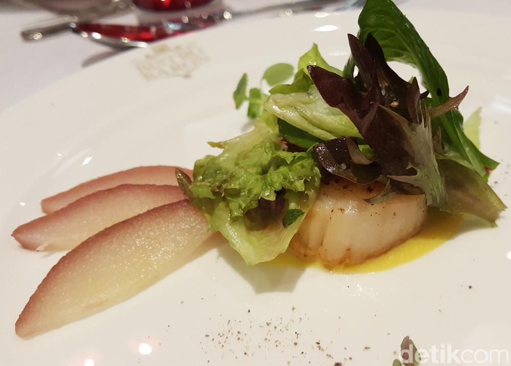 Sebagai pembuka, Scallop dan pir Amerika disajikan dengan cantik. Pan seared scallop yang gurih kenyal dipadu dengan pir yang sudah direbus dengan red wine. Buntut sapi Amerika disajikan chef dalam bentuk consomme dengan isian baby carrot. Daging buntut yang empuk dipadu dengan kaldunya yang jernih gurih.