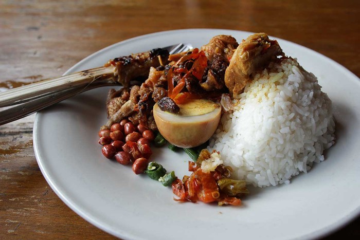 Sesuai nama rumah makannya, Nasi Ayam Kedewatan Bu Mangku memang hanya menjual nasi ayam campur yang khas Bali. Dalam satu porsinya, terdapat beberapa lauk pauk yang disajikan di pinggir nasinya.