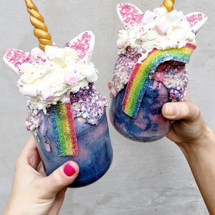 Kreasi baru ini diberi nama 'freakshake' dengan topping mulai dari donat, broenies, cookies, pretzel hingga cotton candy. Bentuknya menjulang dengan aneka warna. Bahkan ada yang berbentuk Unicorn dan aneka warna seru lainnya.