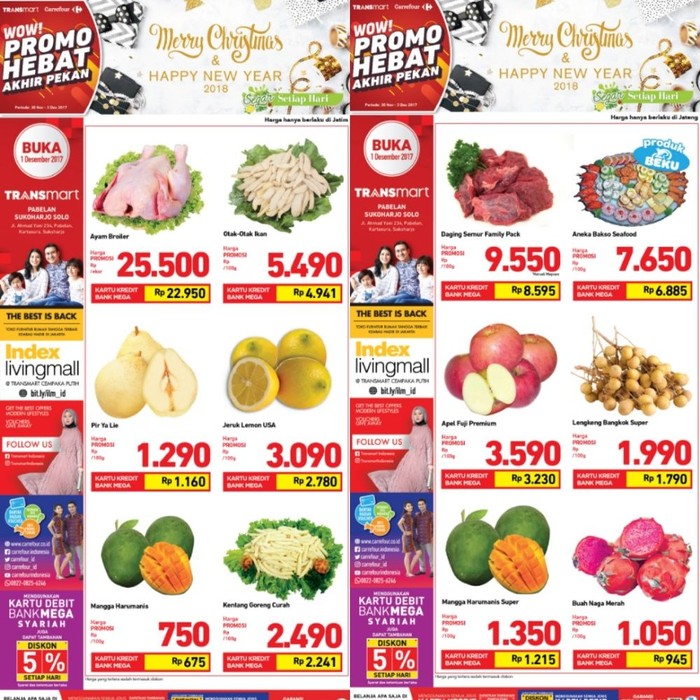 Promo ini berlaku pada akhir pekan mulai 30 November-3 Desember 2017 di Transmart dan Carrefour wilayah Jabodetabek dan Serang. Bagi yang bertransaksi menggunakan kartu kredit Bank Mega, akan mendapatkan potongan diskon 10% dan bagi yang bertransaksi menggunakan kartu debit Bank Mega akan mendapatkan diskon 5% sepanjang tahun.