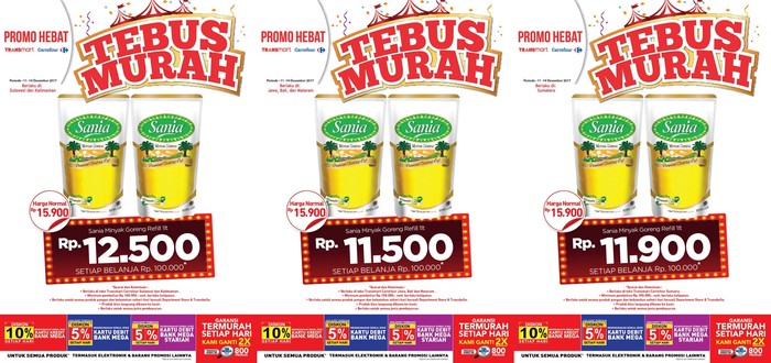 Penawaran istimewa bagi pelanggan ini berlangsung pada 11-14 Desember 2017. Tebus murah Minyak Goreng Sania Refill 1 liter hanya seharga Rp 11.500/pouch (khusus Jawa, Bali, dan Mataram), Rp 11.900/pouch (khusus Sumatera), Rp 12.500/pouch (khusus Sulawesi dan Kalimantan) dari harga normal Rp 15.900/pouch.