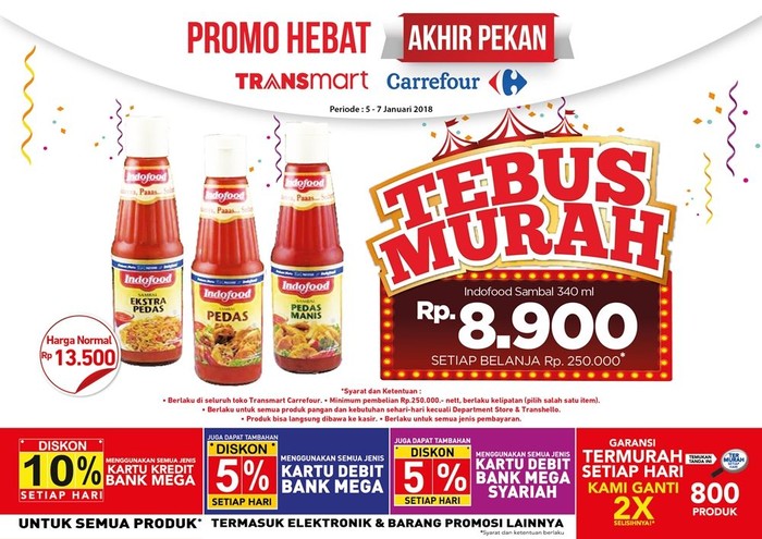 Berbagai promo akhir pekan ini berlangsung mulai dari Jumat sampai Minggu (5-7 Januari 2018) di Transmart dan Carrefour. Untuk melihat promo lebih lengkap klik di sini