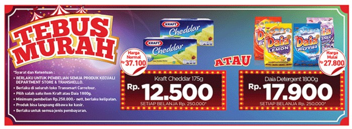 Tebus murah ini berlaku untuk setiap pembelian minimum Rp 250.000 (hanya untuk pembelian produk bahan segar dan groseri pangan, kecuali pembelanjaan di Transhello, department store, dan produk reward). Program itu berlaku untuk semua jenis pembayaran dan juga berlaku kelipatan.