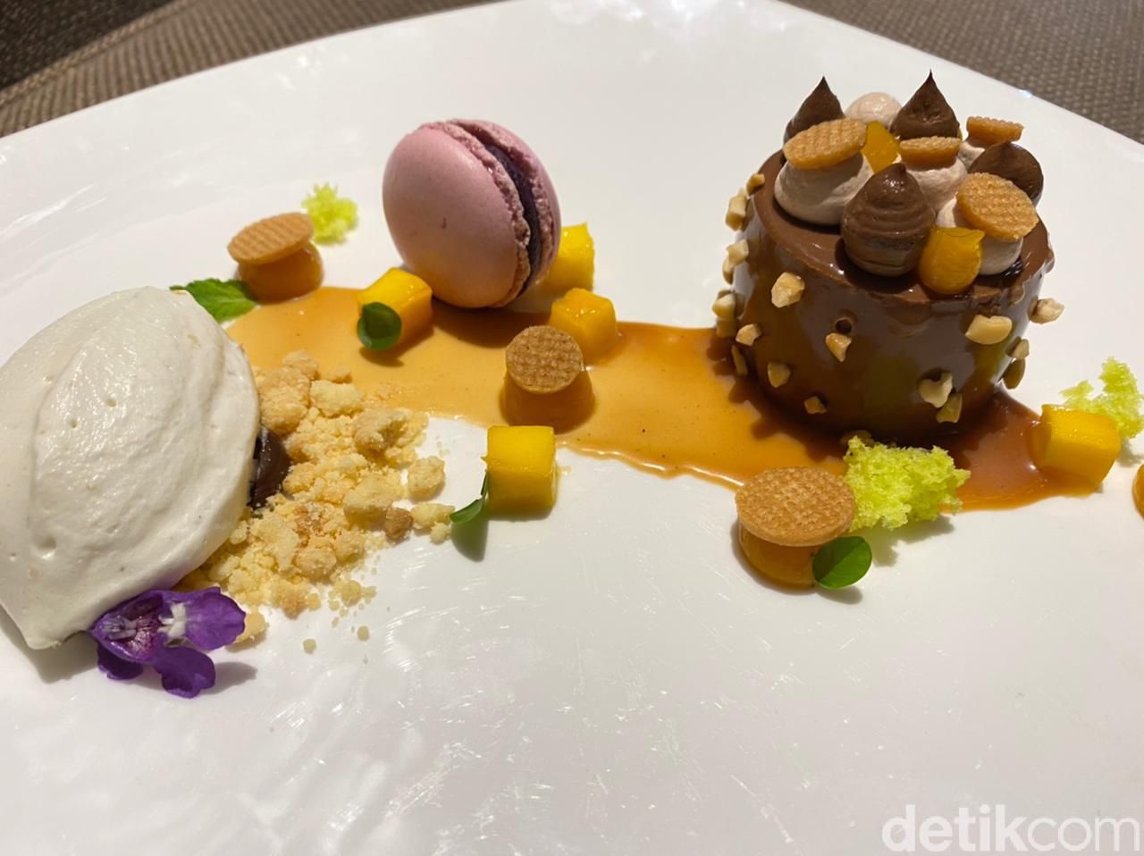 Dalam 10 Hands Dinner ini, Chef Eric yang akan bertanggung jawab menyajikan makanan penutup berupa Chocolate royaltine, macaron, Mango citronella dan Tonka bean ice cream yang ditata cantik.