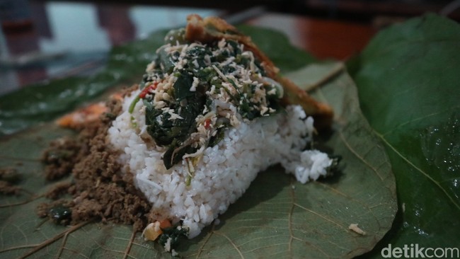 Menurutnya nasi aking daun jati disajikan dengan kuluban ataupun urap. Tak hanya itu nasi aking cocok ditemani dengan berbagai lauk. Pembeli pun bisa memilih lauk yang disukai. Mulai dari jengkol, pedo, hingga telur dadar.