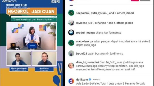 Lalu bagaimanakah cara membangun bisnis kuliner yang bisa meraup banyak keuntungan? Pada kegiatan EXPO(RT) BRILIANPRENEUR 2021 'Ngobrol jadi Cuan' melalui tayangan live Instagram @detikcom dan @bankbri_id pada Sabtu (27/11/2021) BRI dan detikcom mengadakan kolaborasi informatif seputar bisnis kuliner.