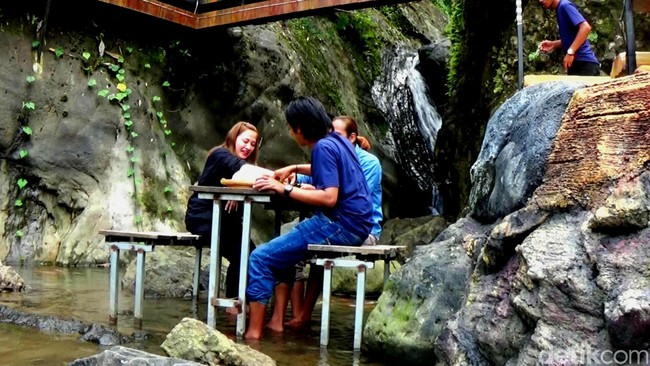 Pengunjung bahkan bisa duduk di kursi yang memang diletakkan di tengah aliran sungai. Saat makan, pengunjung juga bisa mencelupkan kakinya ke air sungai sambil ditemani ikan koi yang berenang di antara kaki.