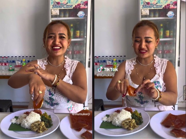 Lewat akun @lilumukerji (10/3), seleb TikTok bernama Lina Mukerji pamer momen makan di Bali. Ia memesan nasi dengan lauk lawar dan kulit babi kriuk. Ia secara sadar memesan makanan nonhalal tersebut meski dirinya adalah seorang muslim.