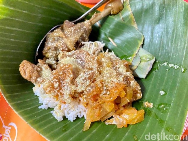 Pincuk daun pisang itu dialasi mangkuk yang cekungannya dalam sehingga memudahkan pembeli untuk menikmati. Terakhir, nasi ayam Semarang disiram kuah opor dan areh yang kental gurihnya nikmat!