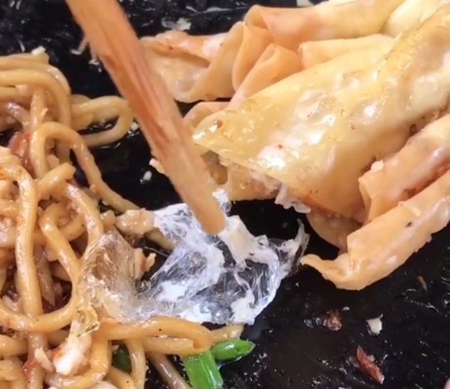 Seperti dilihat detikJatim, Jumat (2/6/2023), terlihat sebuah plastik bening berukuran kecil berhasil dikeluarkan dari pangsit goreng yang hendak dimakan.