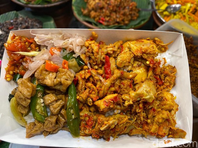 Pilihan lauknya ada ayam betutu suwir, ayam pelalah, sate lilit, tumis sayur tahu, tumis usus, mie goreng, kulit ayam krispi, hingga pilihan sambal matah dan sambal rawit ekstra pedas.