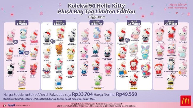 Restoran cepat saji McDonald's Indonesia memberikan kejutan spesial. Berkolaborasi dengan Sanrio Asia Tenggara, McD Indonesia menghadirkan 50 karakter boneka Hello Kitty berbentuk gantungan tas.