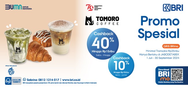 Ya, sampai dengan 30 September 2024 mendatang, BRI sedang memberikan promo untuk setiap transaksi menggunakan QRIS BRImo di seluruh cabang Tomoro Coffee di Jabodetabek. Kamu bisa mendapatkan cashback 10% setiap hari Senin-Jumat. Lalu ada juga cashback sebesar 40% khusus di akhir pekan, hari Sabtu - Minggu.