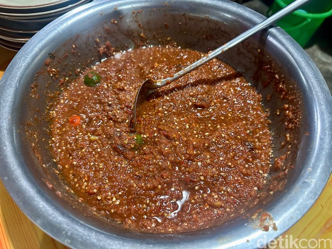 Untuk sambalnya dibuat dadakan alias segar. Karenanya hanya bertahan di suhu ruang sekitar 6-7 jam saja. Sambal ini dibuat dari cabai rawit kecil-kecil, tomat kecil, terasi, dan garam kasar.