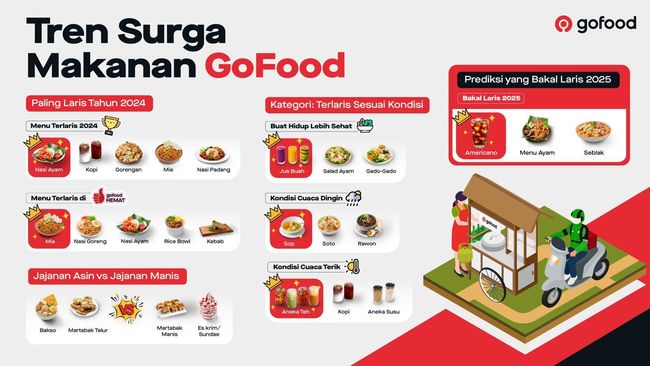 "Kami kembali mempersembahkan laporan 'Tren Surga Makanan' GoFood untuk memberikan inspirasi bagi para pelanggan untuk menjelajah kuliner. Lebih dari itu, laporan ini juga menjadi acuan dan inspirasi bagi para mitra usaha untuk semakin mengenal selera pasar dan mengembangkan bisnisnya. Misalnya, untuk berinovasi dalam membuat menu atau paket makanan, hingga mempelajari perilaku pelanggan untuk membuat strategi iklan di GoFood," ujar Head of Marketing Food & Ads Gojek Ignatius Satrio (Rio) dalam keterangannya, Selasa (11/2/2025).