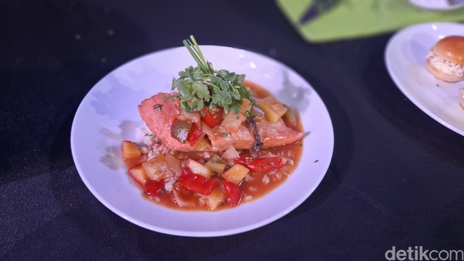 Menu selanjutnya, ia ditantang untuk mengolah ikan salmon dari lautan Alaska. Salmon wild caught atau yang ditangkap secara liar ini diolahnya dengan saus asam, manis, pedas yang menggunakan campuran kurma di dalamnya.