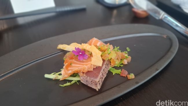 Menu pembuka berupa Tuna dan Salmon Tataki. Potongan daging salmon dan tuna yang dimasak dengan teknik tataki khas Jepang membiarkan sedikit lapisan luarnya matang, tapi daging ikannya tetap kenyal dan terasa segar di bagian dalam.
