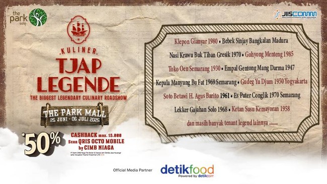 The Park Mall Solo berkolaborasi dengan JIISCOMM (Member of Samsaka Group) menghadirkan Kuliner Tjap Legende Solo yang akan berlangsung pada 25 Juni hingga 6 Juli 2025 di parkir barat, The Park Mall Solo.