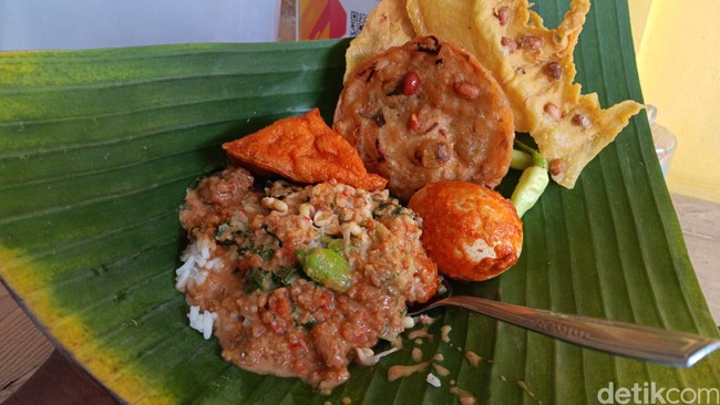 Nasi pecel di sini disajikan secara khas, dipincuk dengan daun pisang. Seporsinya dibanderol Rp 7 ribu, sudah lengkap dengan rempeyek, kering tempe, serundeng, dan aneka sayuran. Pengunjung juga bisa memilih lauk tambahan sesuai selera.