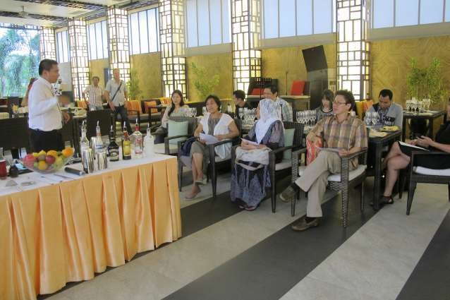 - 'Bartending and Wine Class' yang berlangsung Sabtu (15/6/2013) malam di Satoo Garden, Hotel Shangri-la Jakarta berlangsung meriah. Aldrin Willem, Head Bar Shangri-la juga Mr. Massimiliano, seorang wine maker dari Italia siap membagi ilmunya.