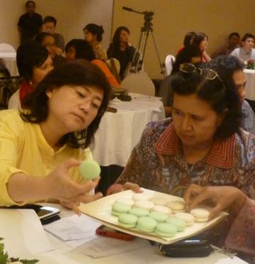 Sebelum resep Macaron diperagakan, Ibu Rina, Ibu Minon, dan Ibu Novianti beruntung mendapatkan voucher makan dari Asia Restaurant, The Ritz Carlton Kuningan yang diundi sebagai doorprizes. Macaron yang sedang naik daun di banyak cake shop dan bakery ini memang menyita perhatian peserta.