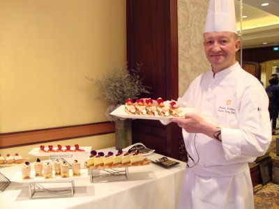 Chef Scailteur mengawali acara yang dimulai sore hari ini dengan mempraktikkan cara membuat 'BATS Cheese Cake'. Cheese cake klasik ini sudah 20 tahun jadi favorit di BATS, salah satu restoran di Shangri-La Hotel Jakarta.