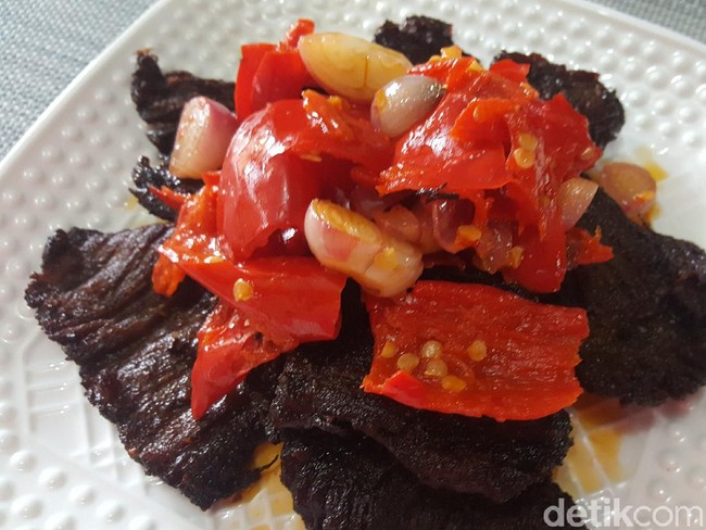 Dendeng balado yang satu in jadi kegemaran banyak orang terutama yang sedang kangen masakan Padang. Dendengnya garing gurih disiram lado yang renyah pedas asam. Juara enaknya.