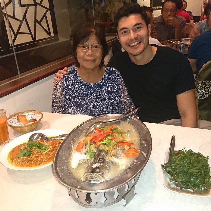 Aktor berusia 31 tahun ini tetap dekat dengan sang ibu, menjadi anak tunggal membuatnya sering menemani sang ibu makan di restoran. Hidangan steam fist dan sayuran kangkung jadi menu makan malam mereka. Foto: Instagram @henrygolding