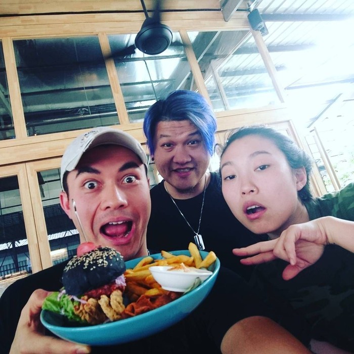Black burger dengan kentang goreng, onion rings, serta saus mayo jadi menu makan siang Henry ditemani dengan salah satu rekannya Awkwafina. Foto: Instagram @henrygolding
