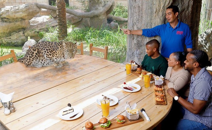 Kalau suka yang sedikit ekstrem, bisa makan siang bareng dengan Leopard atau macan tutul yang akan berjalan-jalan di atas meja Anda. Foto: Istimewa