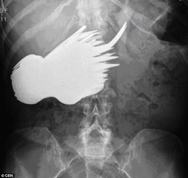 Sendok dan garpu jadi salah satu benda yang paling sering tertelan lewat tenggorokan. Tapi hasil pemeriksaan x-ray yang satu ini tunjukkan belasan sendok dan garpu yang berada di dalam perut manusia. Foto: Pool/Site