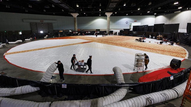 Los Angeles - Sejumlah koki di Los Angeles tengah membuat Pizza terbesar di dunia. Mereka berusaha membuat Pizza seluas 1.320 meter persegi untuk memecahkan rekor.