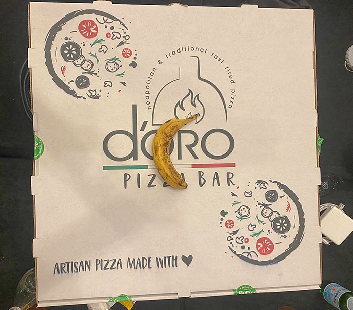 Sebuah gerai pizza memiliki ukuran pizza utuh yang sangat besar. Bahkan jika dibandingkan dengan sebuah pisang, kotak pizzanya terlihat seperti meja yang lebar. Foto: Bored Panda