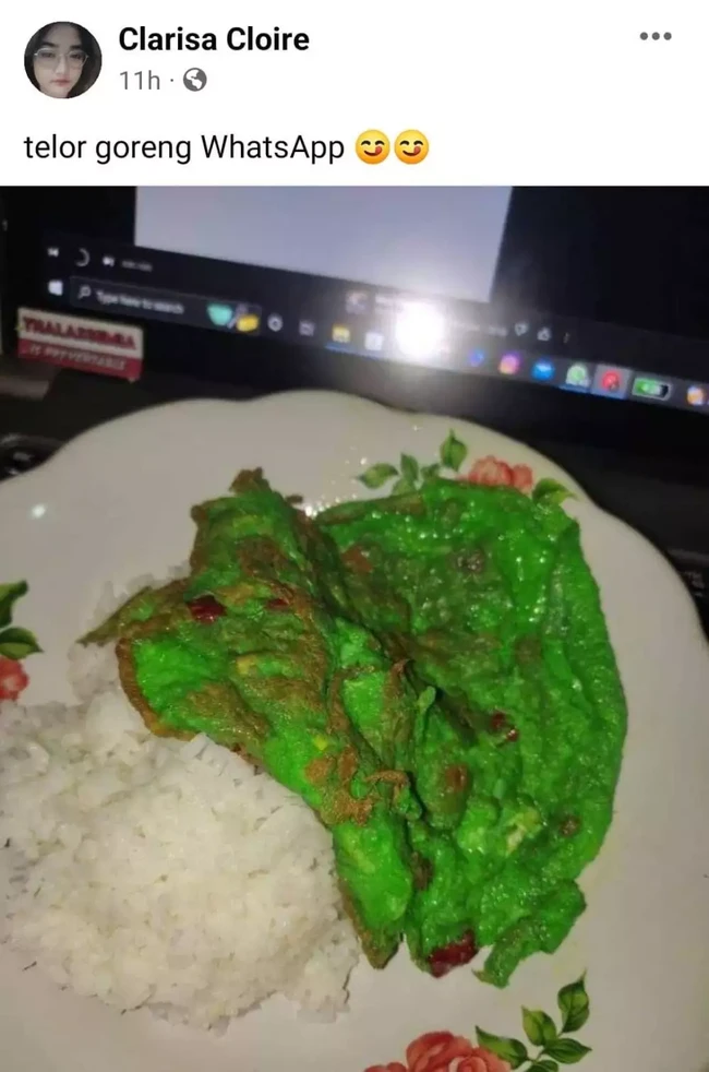 Melakukan eksperimen pada telur dadarnya, netizen ini menyajikan telur dengan warna yang aneh. Telur berwarna hijau cerah ini dijuluki Telur Goreng Whatsapp. Foto: 1cak.com