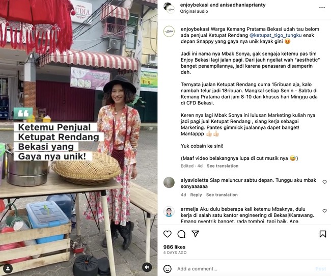 Penjual ketupat rendang ini bernama Sonya. Sosoknya viral usai diunggah TikTok Enjoy Bekasi Official (28/5). Kreator video itu memuji penampilan Sonya yang stylish, meski hanya jualan di kaki lima. Foto: TikTok Bekasi Official