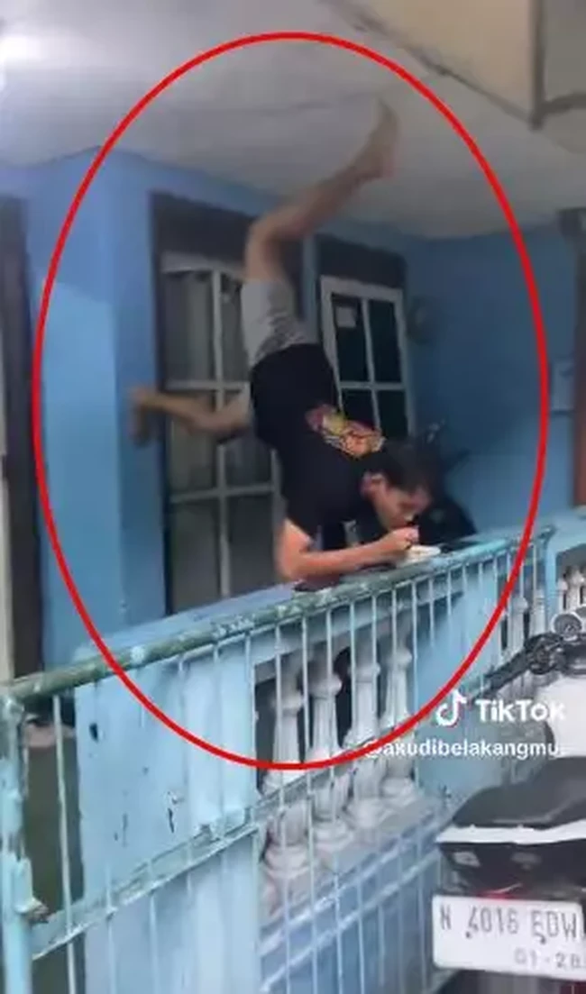 Bukannya makan di meja makan, netizen ini memilih untuk menyantap makanannya di teras rumah. Posisi kakinya yang menghadap atas bikin siapapun yang melihatnya kebingungan. Foto: 1cak.com