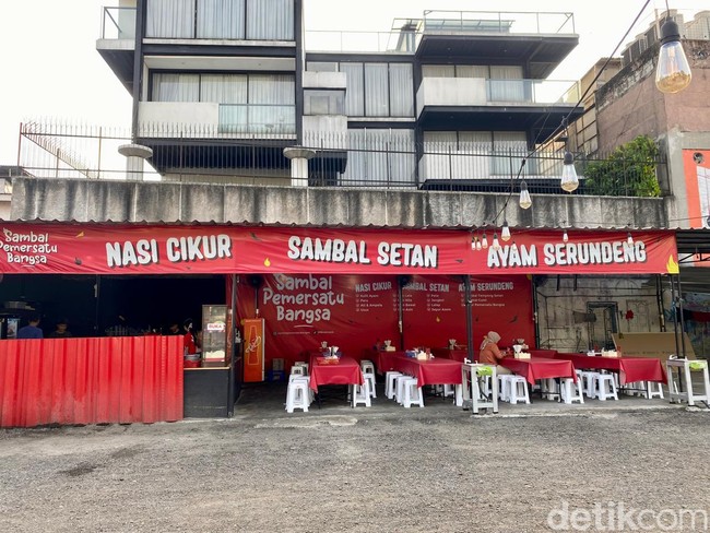 Ada warung tenda kaki lima yang tampil mencolok dengan warna serba merah, yaitu Sambal Pemersatu Bangsa. Warung ini cukup sering diulas oleh food vlogger. Foto: detikFood