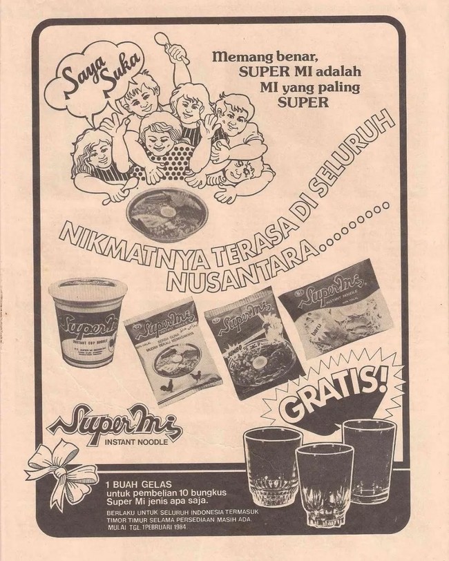 Ini merupakan poster iklan produk mie instan merek Supermi. Ada hal yang menarik, karena berhadiah 1 gelas untuk pembelian 10 bungkus. Foto: Instagram @potolawanofficial
